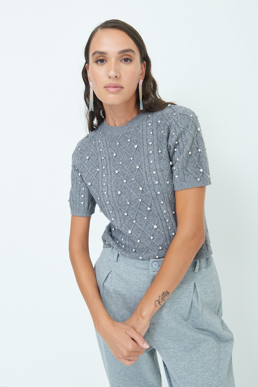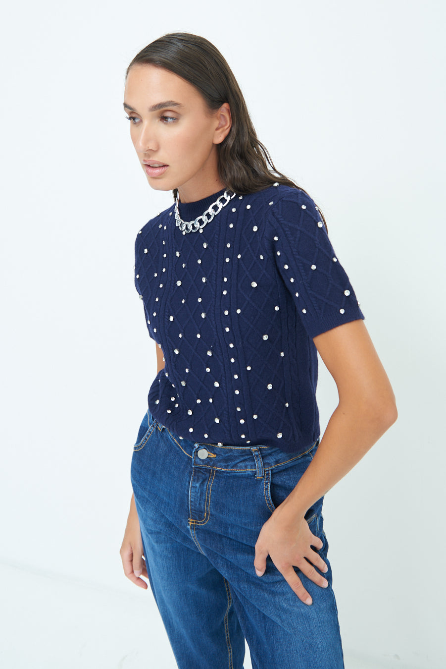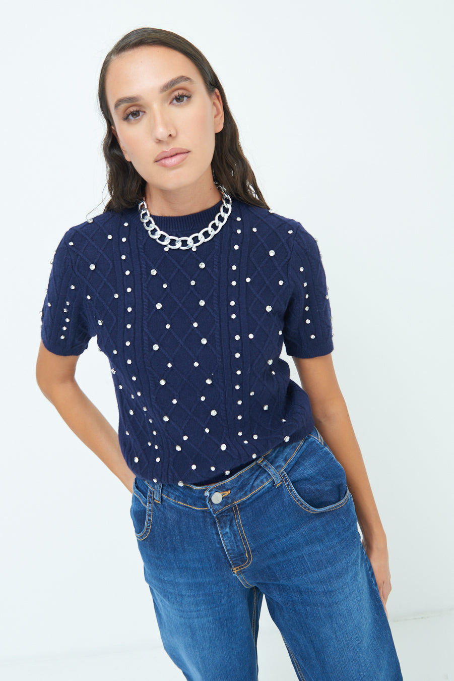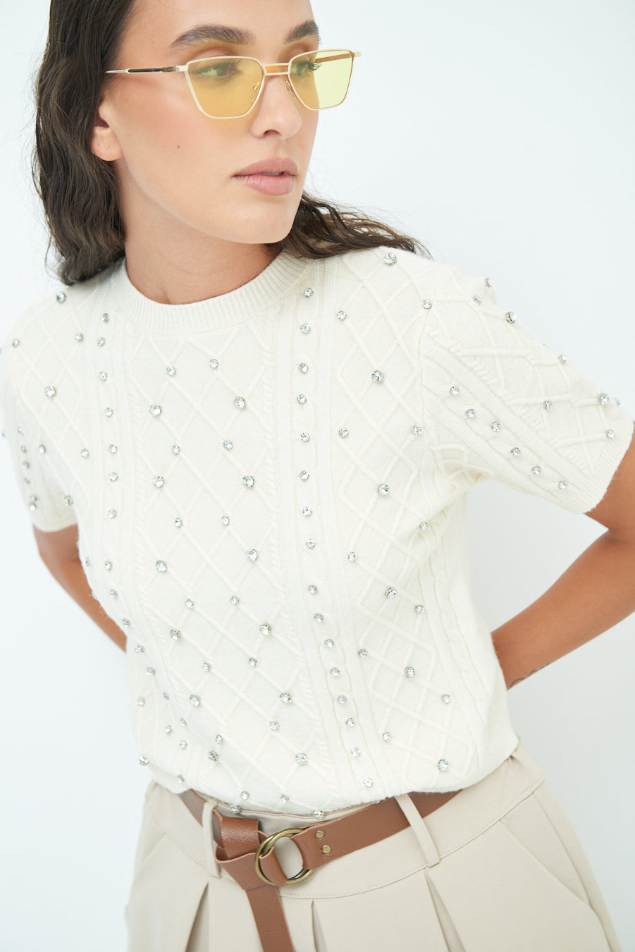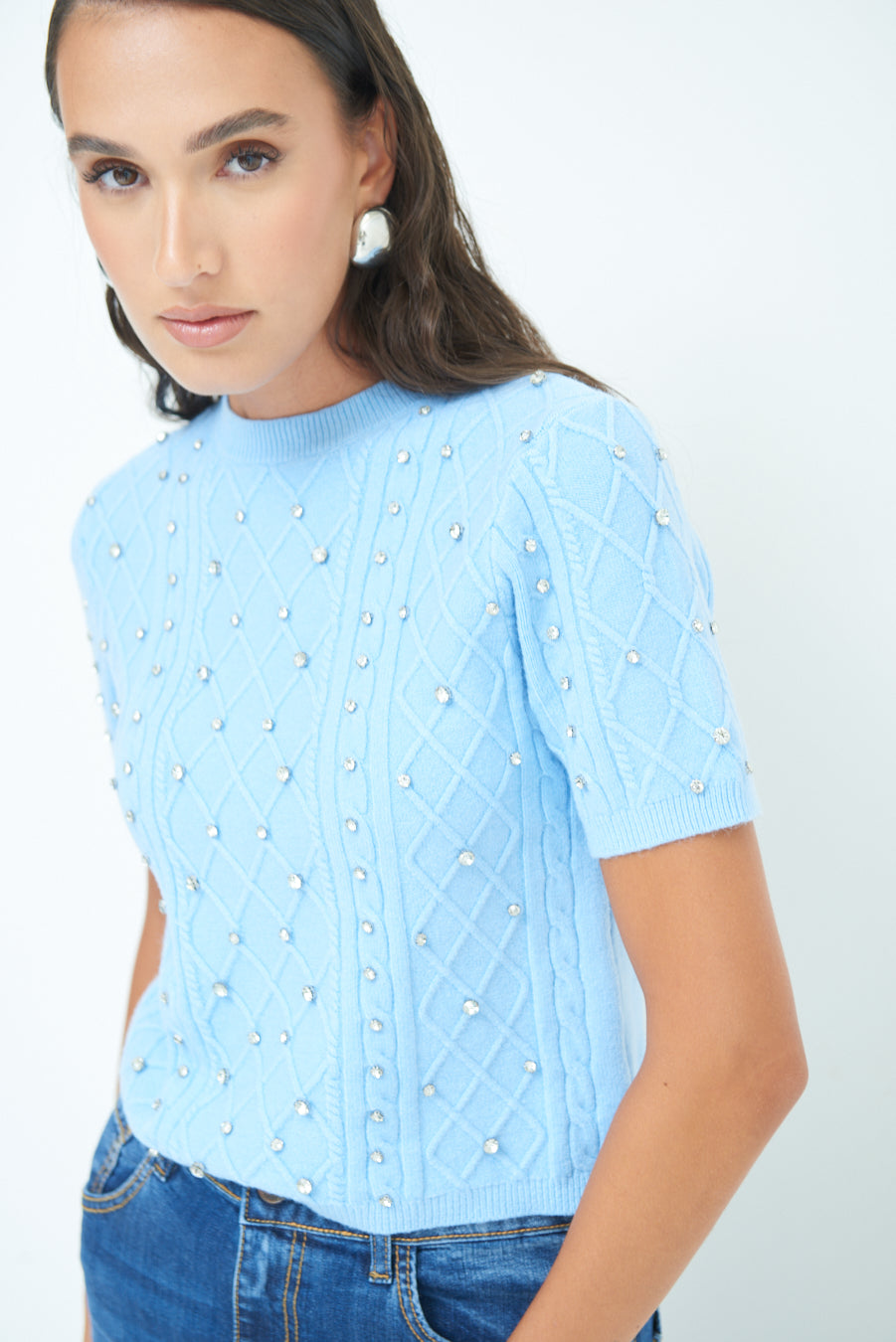 Pearl embellished short-sleeve knit top wholesale