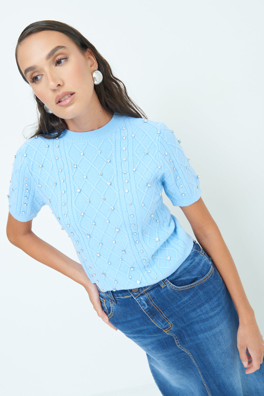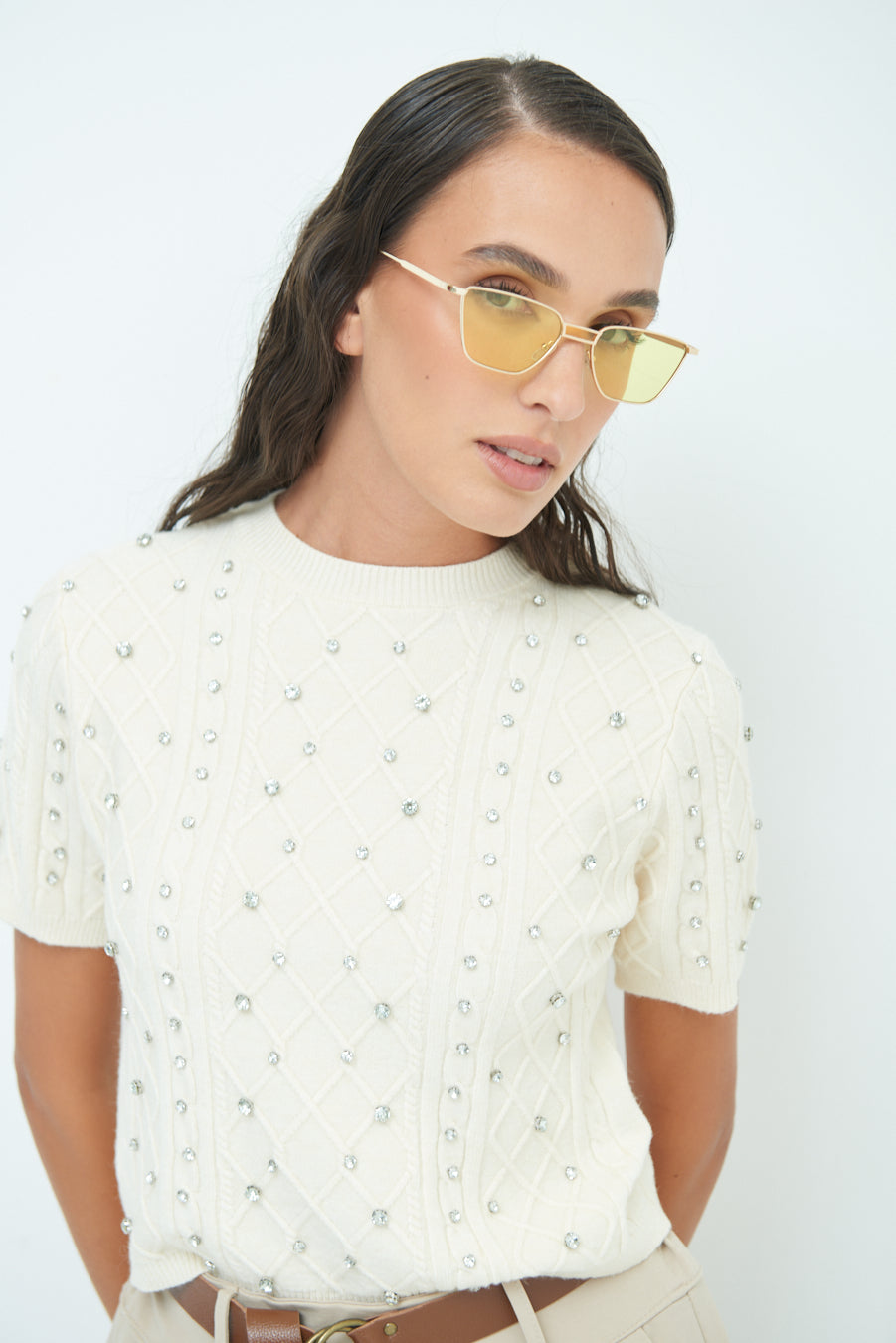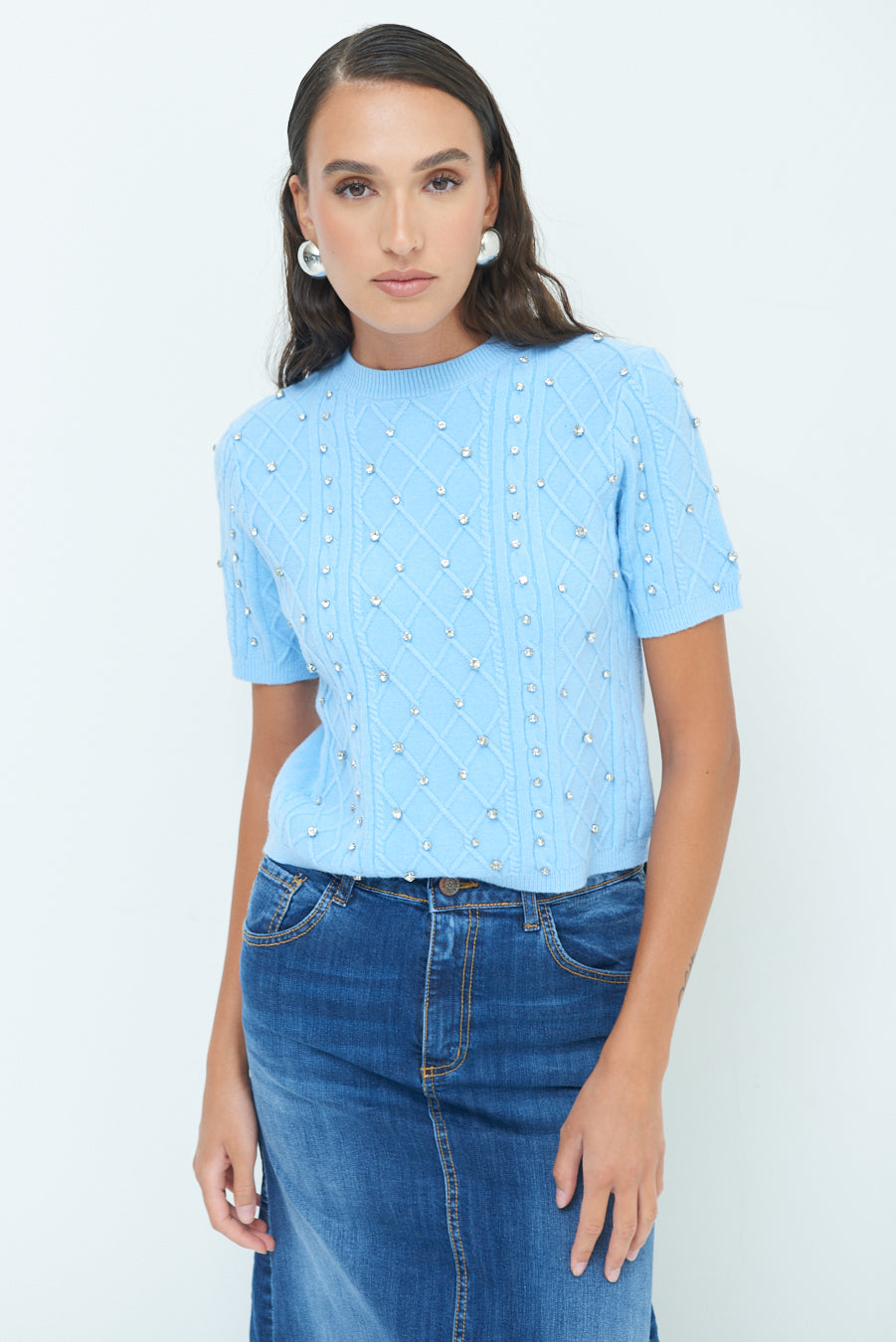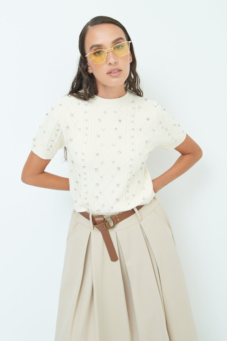 Pearl embellished short-sleeve knit top wholesale