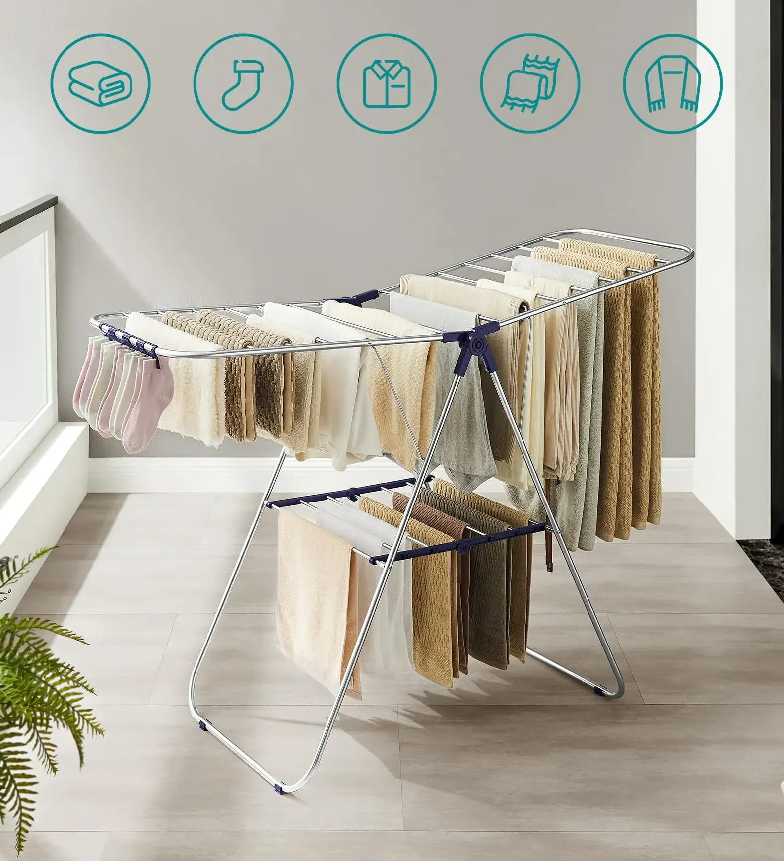 Stainless steel gull-wing space-saving clothes drying rack, foldable for easy storage, silver